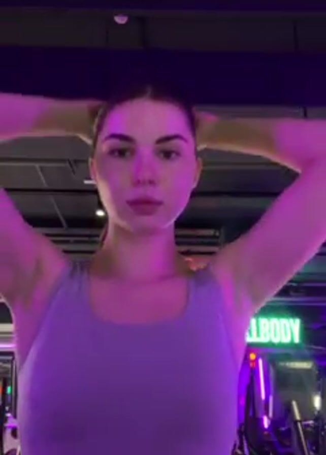young woman standing in a gym setting, illuminated by purple and blue lighting. She is wearing a light grey sports bra and her hair is pulled back into a ponytail. The camera is positioned at chest level, looking upwards at the woman. The background reveals part of the gym's ceiling, with metal bars and a light fixture. Additionally, there's an illuminated green sign with a white arrow pointing to the right. The woman gathers her hair and adjusts it into a ponytail.
