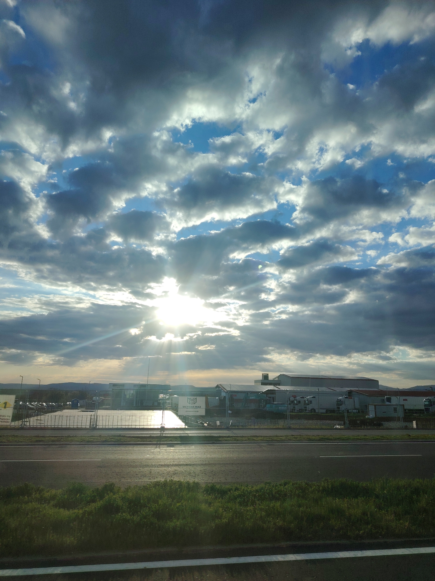 The image depicts a scene in Lyaskovets, Bulgaria, featuring a road and a building complex under a cloudy sky with the sun shining through. The road is black asphalt with a white line marking the edge, and green vegetation is growing on the roadside. Beyond the road, a fenced-off area contains what appears to be a building under construction, with various construction materials and equipment visible. A row of parked trucks is lined up against the background buildings. The buildings themselves are a mix of industrial and commercial structures, with metal roofs and various architectural styles. The sky is filled with a mix of grey and white clouds, with patches of blue sky visible. The sun is positioned high in the sky, shining through the clouds and creating rays of light.
