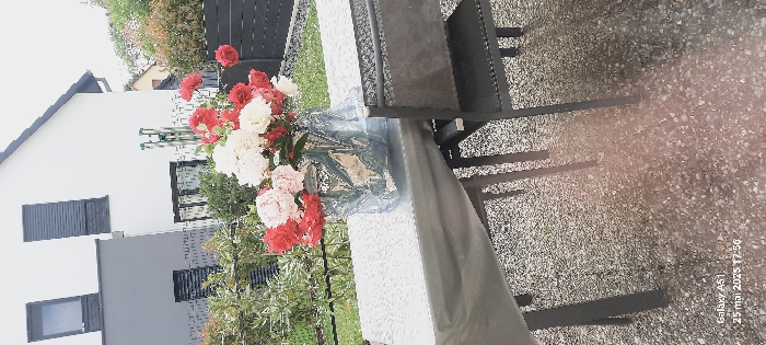 bouquet of red and white flowers in a blue and white ceramic vase on a grey tablecloth on a patio table. There is a black metal chair in the foreground. The scene is taken in the backyard of a house located at 48.541 latitude and 7.714 longitude in the city of Ostwald, France. The house is white with a grey facade and black window frames. There is a window on the side of the house, as well as a window to the left of the house. The image appears to be taken on a cloudy day, and there is a light breeze. The flowers are partially obstructing the view of the house. The background is obscured by bushes and trees. The ground of the patio is made of gravel.