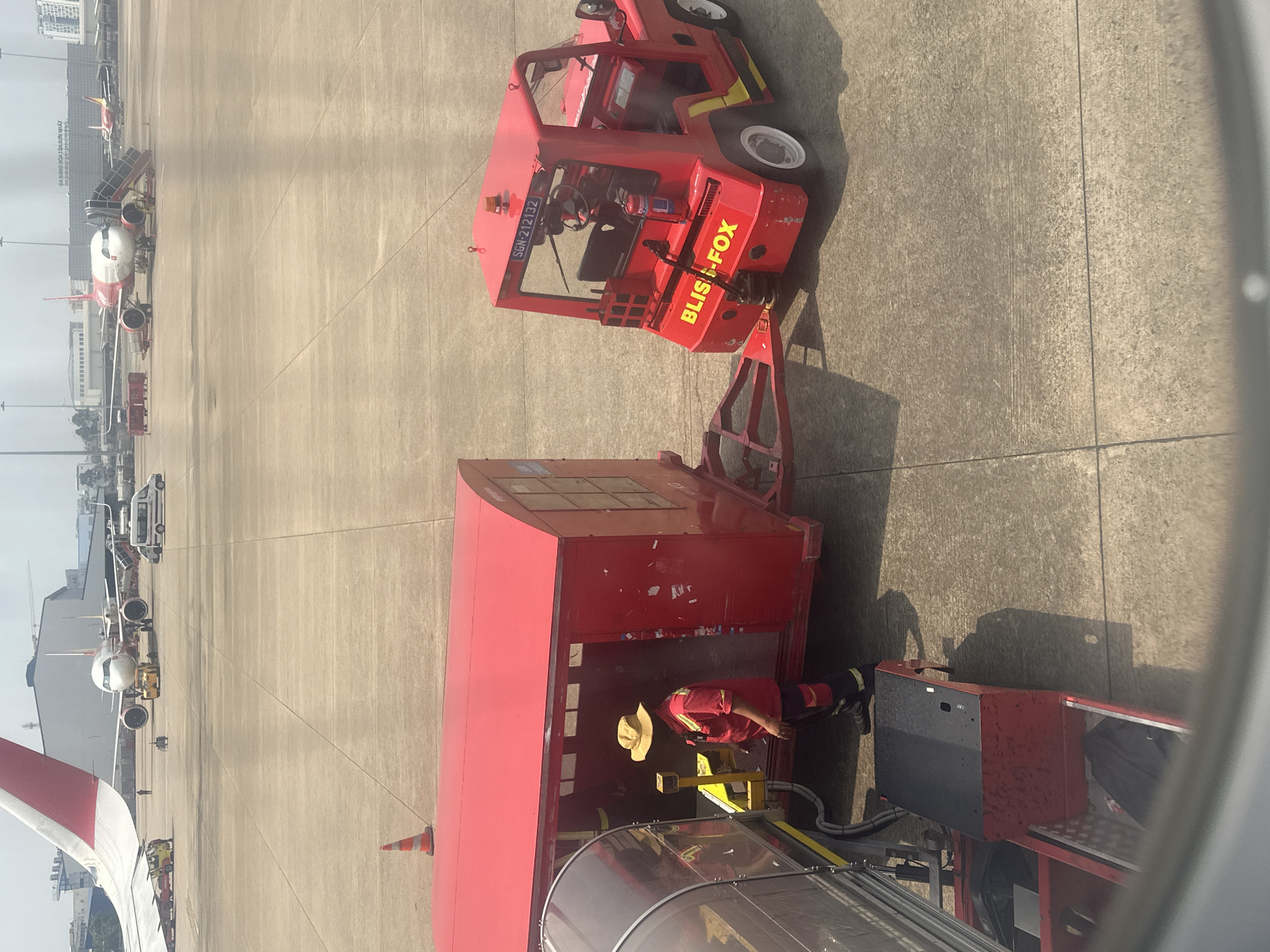 The image provides an elevated view of an active airport tarmac under bright daylight