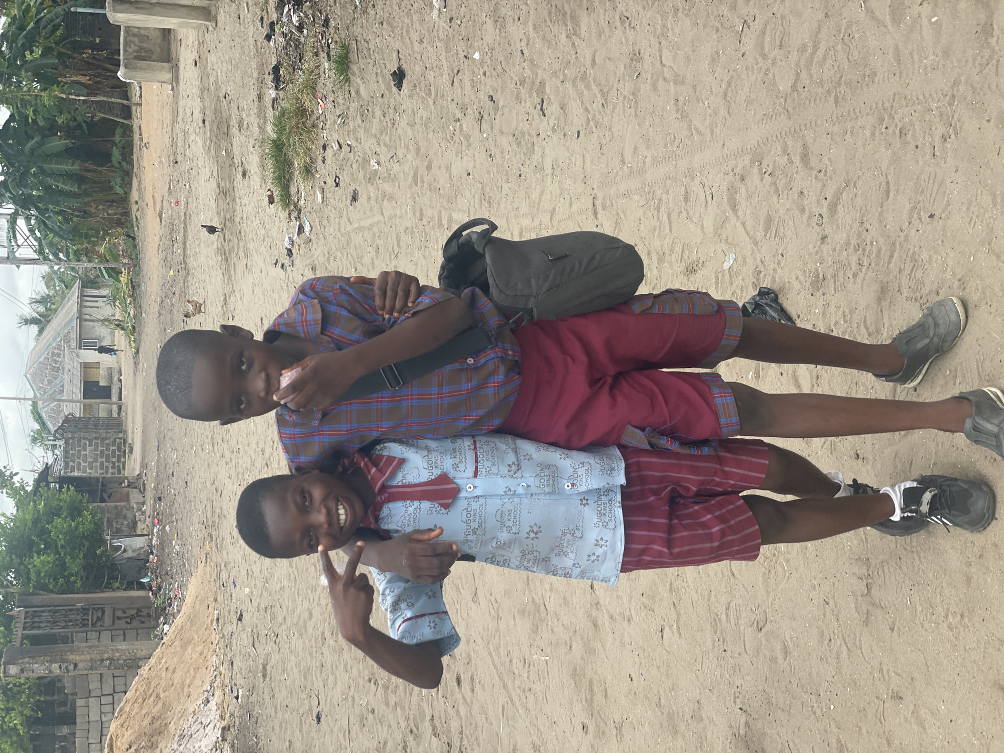 Two young boys, presumed to be schoolmates based on their similar uniforms (red and white plaid shorts and collared shirts, one plaid and one printed), are lying perpendicular to each other on a sandy surface. The boy on top is wearing a backpack and holding something in his hand. The boy on the bottom is flashing a peace sign. The environment appears to be an unpaved area in Badagry, Nigeria with buildings and vegetation visible in the background. Debris and litter are scattered on the ground.
