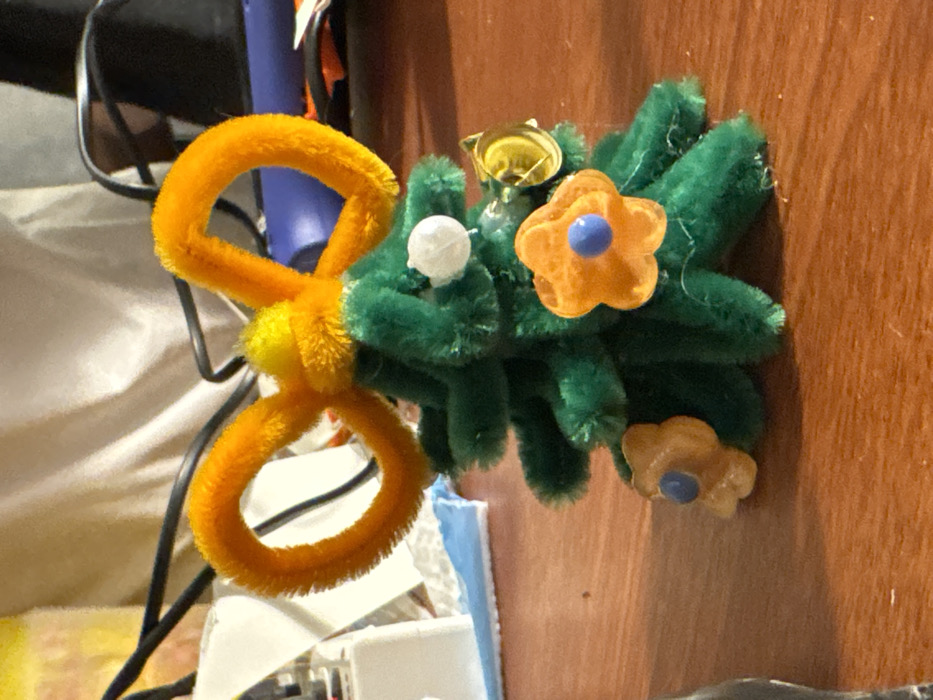 A craft project sits on a wooden surface. It consists of green pipe cleaners bundled together to resemble a spiky plant, decorated with orange plastic flower-shaped pieces with blue centers. There is also a small gold bell and a white ball attached. An orange pipe cleaner forms a bow shape attached to the side of the green bundle. Cords and a blue object are visible in the background.