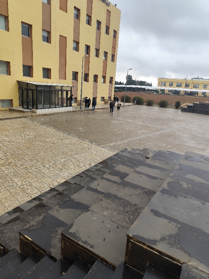 The image captures an outdoor scene at an institutional campus in Jibb as-Safa, Syria, under an overcast sky