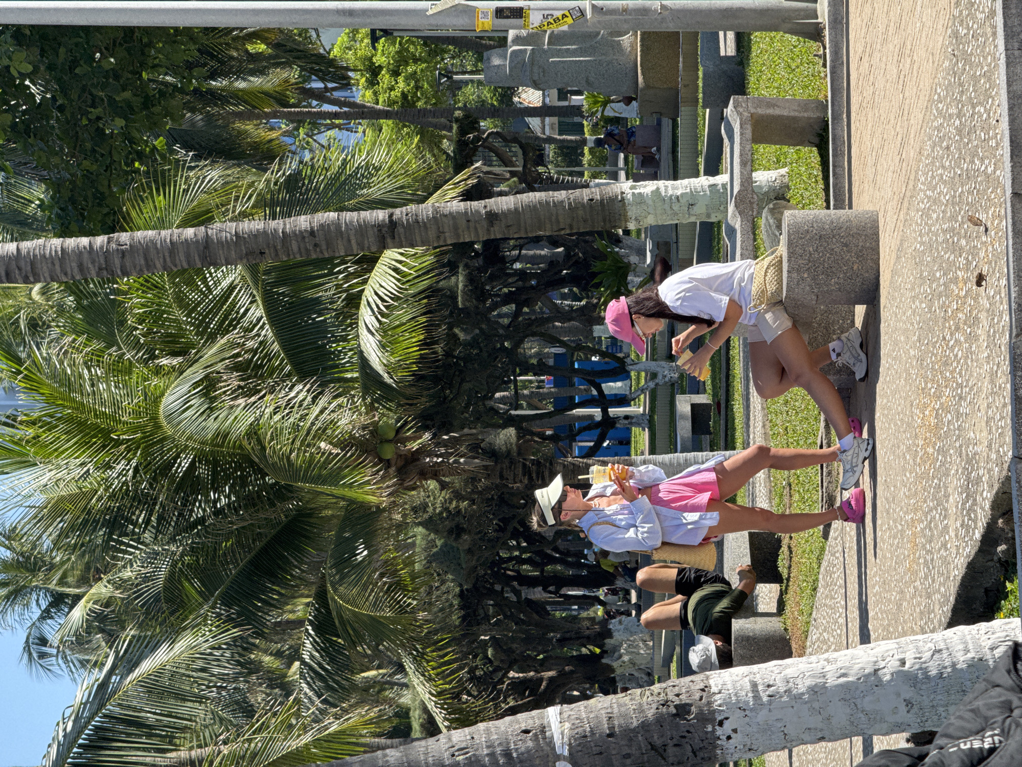 The image depicts an outdoor park or promenade area in Nha Trang, Vietnam, under clear, sunny conditions. In the foreground, two adult females are interacting. The woman on the left stands facing right, holding a clear plastic cup with an orange beverage and a straw in her right hand. She wears a white long-sleeved button-up shirt over a pink top, pink shorts, a white visor, sunglasses, and pink sandals. A light-colored woven tote bag hangs from her left shoulder, and an anklet is visible on her left ankle. The woman on the right is seated on a cylindrical gray stone bench, facing left. She wears a pink baseball cap, a white t-shirt, light-colored shorts, and white athletic shoes with white socks. She holds a yellow-wrapped item in both hands. A small woven bag rests beside her on the bench. To the left of the standing woman, an adult male is partially visible, lying prone on a gray stone bench. He wears a dark green shirt, dark shorts, and a light-colored hat. Further in the background, another individual is seated on a separate stone bench. The environment features numerous tall palm trees with green fronds, some bearing visible coconuts. Other tropical trees and lush green grass are present throughout the park. The bases of several tree trunks are painted white. Pathways are composed of light-colored, patterned paving stones. Various gray stone benches and sculptural elements are distributed across the scene. A gray utility pole, marked with stickers (some displaying Cyrillic script, e.g., "ПРАВА"), stands on the far right. Two small birds are visible on the paved ground in the lower right foreground.