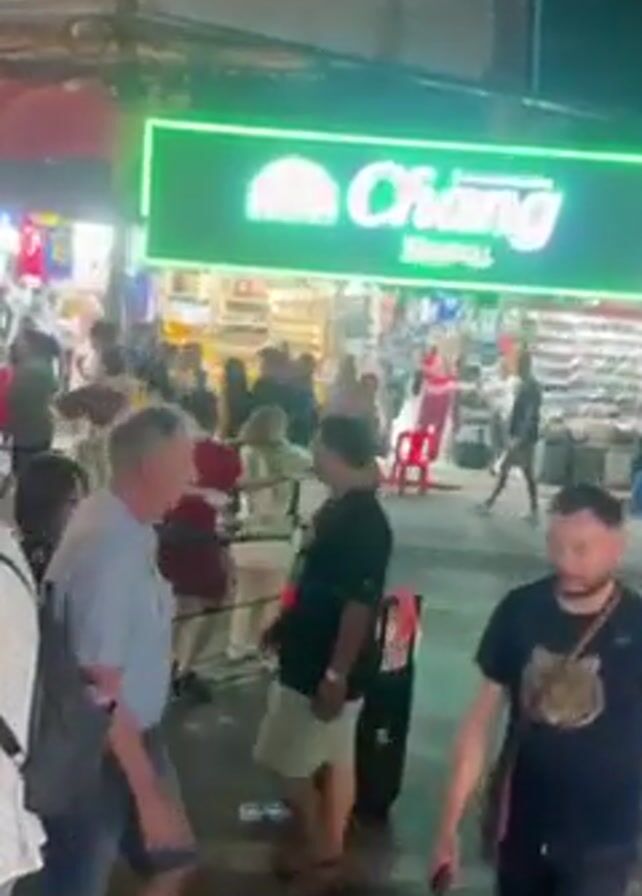 The video depicts a bustling street scene at night, likely in a tourist area. People are walking in various directions, with shops visible in the background. A prominent "Chang" beer sign is illuminated. The camera moves through the crowd, capturing the faces and attire of passersby. Several people are seen carrying bags or suitcases. The atmosphere appears lively, with music playing in the background.