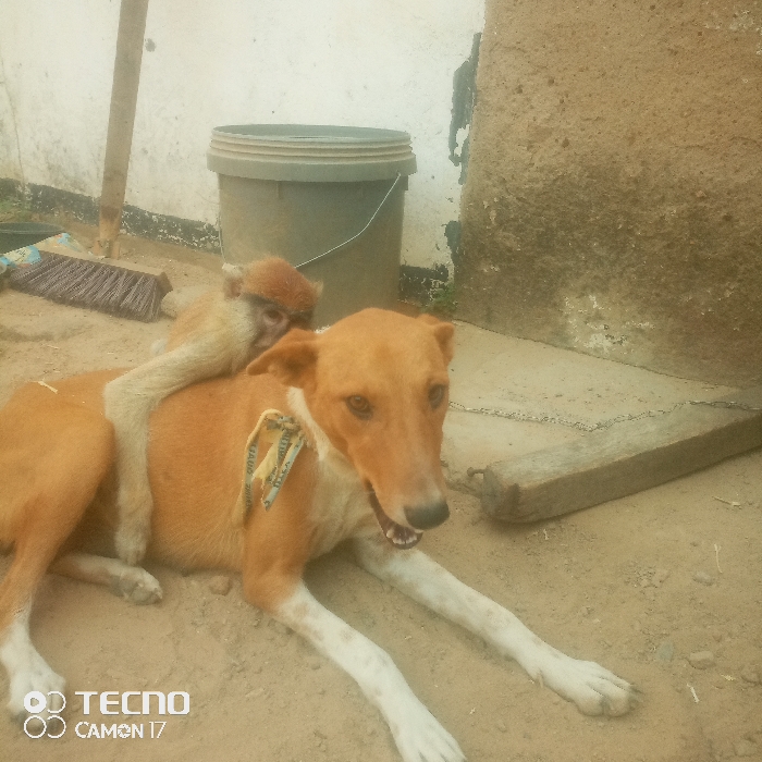 A brown dog with white legs and chest lies on the ground. A small monkey clings to the dog's back, its arm wrapped around the dog's neck. A grey bucket sits in the background against a white wall with black stains. A wooden plank rests on the ground near the dog. The ground is dirt. The camera's watermark is visible in the lower left corner.