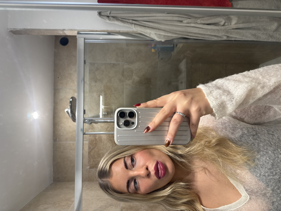 A female individual is depicted in a mirror selfie within a bathroom located in Rousset, France. The subject, possessing long blonde hair, blue eyes, and wearing a light-colored, semi-transparent V-neck top over a dark undergarment, is shown from the chest up. She is making a playful expression with her tongue slightly extended, displaying dark maroon lipstick. Her left hand, adorned with a three-stone ring on the ring finger and nails painted with a two-tone dark polish, holds a light gray smartphone featuring a ridged case. The background, visible through the mirror, reveals a modern bathroom with beige tiled walls and a glass shower enclosure. Inside the enclosure, a chrome showerhead, a control mechanism, and blurred toiletries are discernible. A light gray towel hangs on a fixture to the right of the shower, with a red fabric item partially visible at the far right edge of the frame. A recessed ceiling light is also reflected in the mirror.