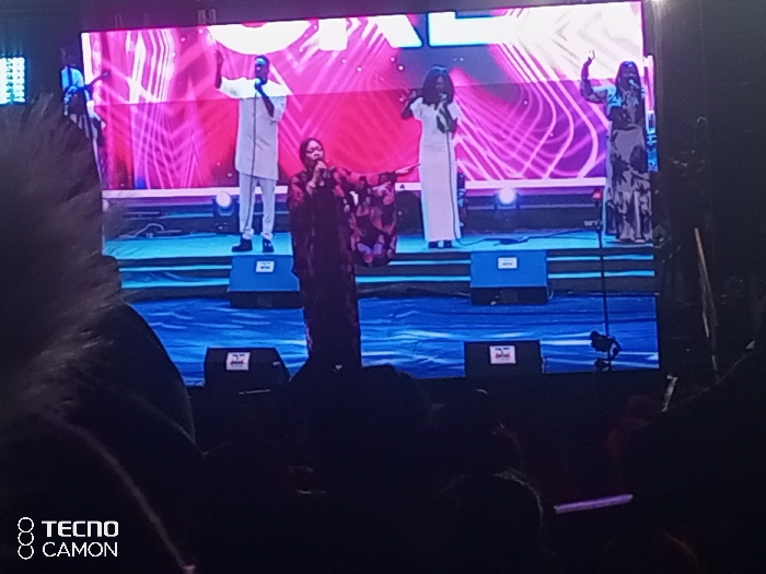 A group of people are performing on stage. There are three women and one man. They are standing on a stage with boxes underneath them. A large LED screen is behind them displaying a light-purple abstract design. The audience is in the dark and their faces are not visible. A phone camera is present in the bottom left.