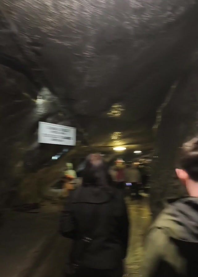 The video depicts a walk through a dimly lit tunnel. People are seen walking ahead. The walls and ceiling of the tunnel are rough and uneven, appearing to be natural rock formations. Artificial lights illuminate the path, but the overall environment is still dark. The floor is slick and reflective, possibly wet. The camera moves forward, following the people in front.