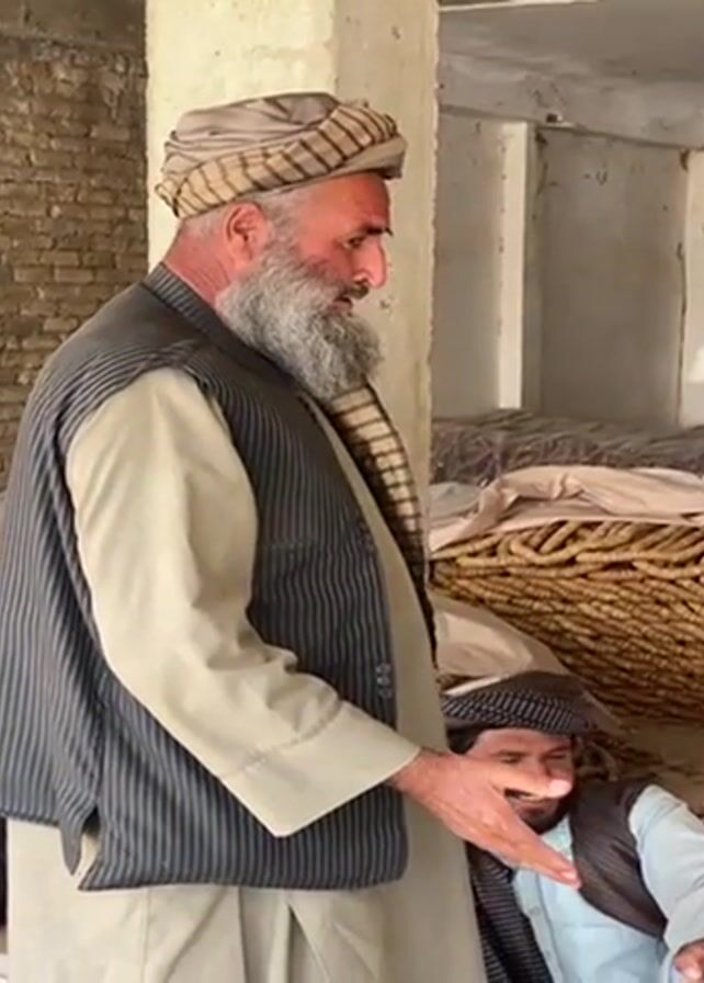 Two men are in an open-air building. The older man, standing, has a long white beard, wears a striped turban, a striped vest, and a light-colored shirt. He is gesturing with his hand towards the younger man who is sitting. The younger man also wears a turban and vest, and looks up at the older man. In the background are stacks of what appears to be tightly bundled sticks. The building has a simple structure of concrete pillars and beams.