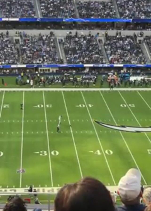 The video depicts a football game in progress at a stadium filled with spectators. The focus is on the field, where a kicker prepares to kick the ball. The field is marked with yard lines and the Chargers logo. The camera angle is from the stands, offering a wide view of the field and the surrounding crowd. People are seated in the foreground, observing the game.