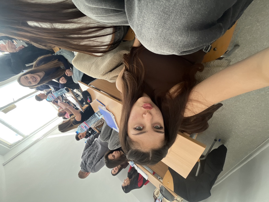 The image depicts a classroom or lecture hall in the city of Veliko Tarnovo, Bulgaria, filled with approximately ten young adults or students. The perspective is a selfie taken by a female subject in the immediate foreground, whose head is tilted and who is looking directly at the camera with a "kiss" face expression. She has long, dark brown hair and wears a dark brown top. Her right arm is visible, extending towards the lower right. To the right of the foreground subject, another student is partially visible, wearing a beige, fluffy jacket over a white top and gray jeans. In the middle ground, several students are seated at light wooden desks with attached chairs. A young woman with long dark hair, wearing a dark long-sleeved shirt, smiles broadly towards the right. Behind her, another young woman with dark hair, wearing a black top, is seated at a desk holding a notebook, with a clear plastic water bottle (branded "Devin") and a blue notebook in front of her. To her left, a young man in a gray hoodie with a dark graphic on the back and gray sweatpants is seated, partially turned away. Behind him, another young man smiles. Further back, more students are visible, some engaging with each other, others looking forward. The room features large windows along the left wall, providing ample natural light. The walls are painted white. Objects present include multiple clear plastic water bottles, blue notebooks, pens, and a black pencil case on various desks. A black bag hangs from a desk in the lower left. The overall scene suggests a casual classroom environment, possibly during a break or an informal session.
