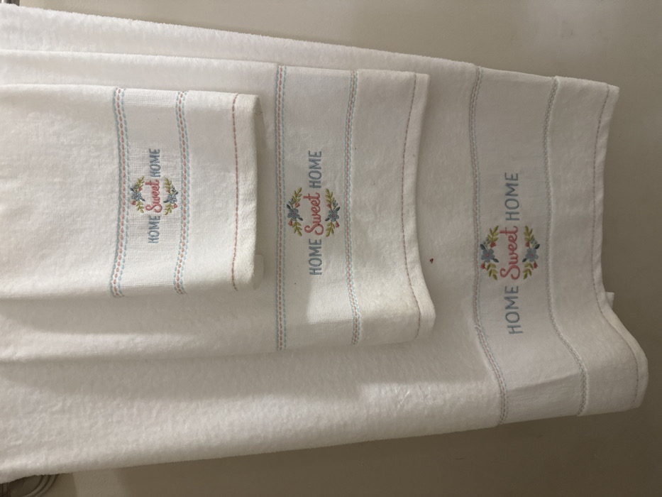 Three folded white towels, each varying in size, are arranged atop one another. Each towel has a decorative striped border featuring a "Home Sweet Home" inscription within a floral wreath. The smallest towel is at the front, partially obscuring the two larger towels stacked behind. The towels appear to be freshly laundered and present a clean and inviting aesthetic.