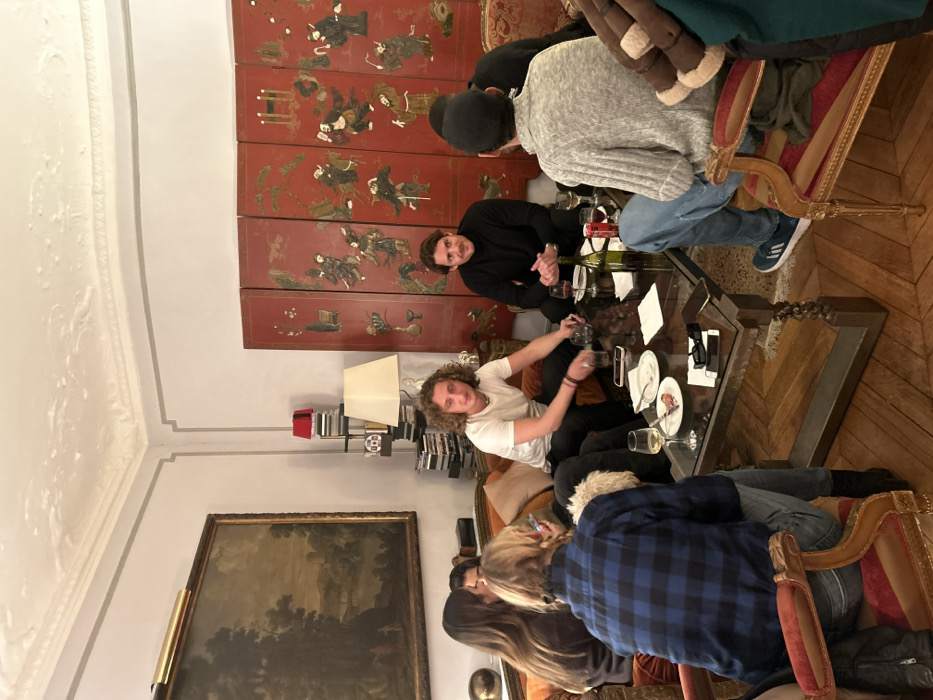 A group gathers in an ornate room with high ceilings and decorative molding. An antique red folding screen adorns the wall behind a glass coffee table holding plates, glasses, and a wine bottle. Individuals sit in ornate chairs and on a sofa, engaged in conversation. One man in a white shirt faces the camera, while another in black sits beside him. A large framed painting hangs on the wall opposite the screen, adding to the room's classic aesthetic.