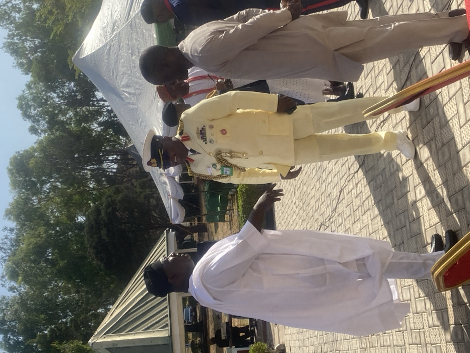 The image depicts an outdoor daytime gathering in Vom, Nigeria. In the foreground, a man wearing a white traditional Nigerian agbada and black cap, facing right, is conversing and gesturing with his right hand towards a man in a light cream-colored military or naval uniform. The uniformed man, wearing a peaked cap, sunglasses, epaulets, and multiple medals or ribbons, smiles while looking left towards the man in white. An identification badge is clipped to his uniform. To the right, a third man in a light brown traditional outfit is partially visible, facing left. The background features several white canopy tents, including a prominent pyramidal tent, and numerous green trees. The ground is paved with gray interlocking bricks, showing distinct shadows. On the far left, a figure is seated near what appears to be sound equipment. A red and gold chair back is visible in the bottom right corner.