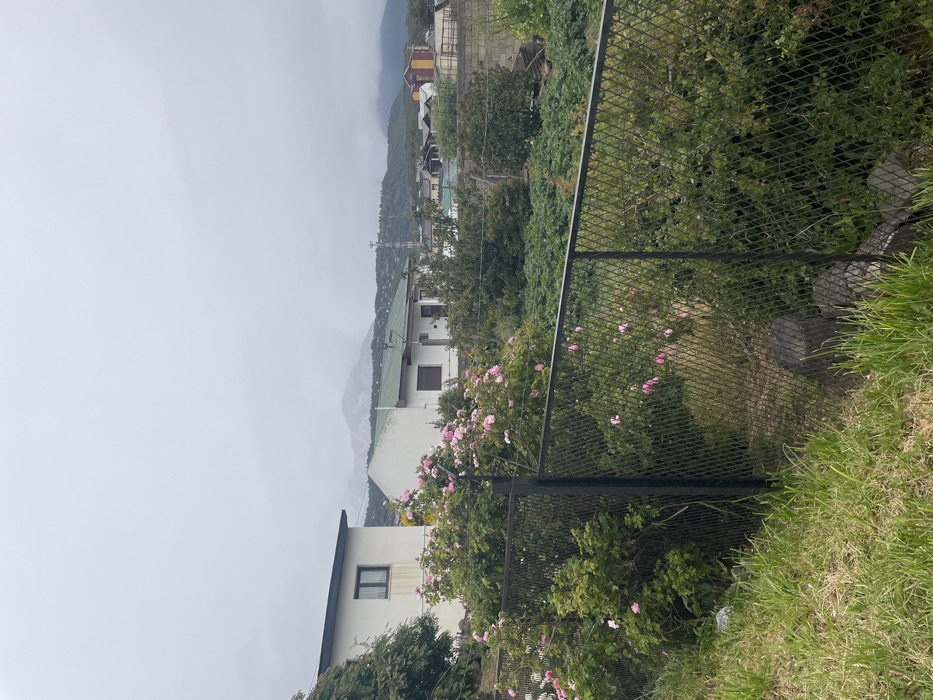 A view from a hillside showcases houses with white walls and green roofs, partially obscured by lush greenery, including flowering bushes with pink blossoms. A black chain-link fence runs along the foreground, with grass and dense vegetation visible. Beyond the houses, a hazy mountain range fades into a cloudy, overcast sky, suggesting a damp or foggy day. Other houses and vegetation are also visible in the distance.