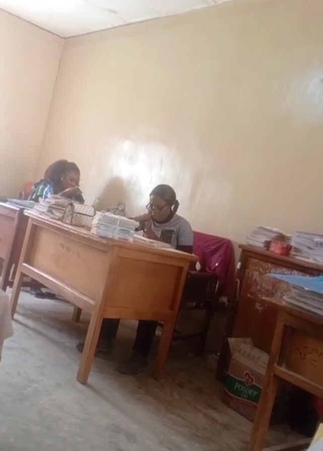 Two women are seated at desks in a modestly furnished room. The room has off-white walls, a tiled ceiling, and a cement floor. Each woman is surrounded by stacks of papers and appears to be working, possibly grading or reviewing documents. One woman wears glasses and has her hair pulled back. The other has curly hair. The desks are wooden and have writing on the front. A box labeled "Power Oil" is visible under one of the desks. The room seems to be an office or classroom setting.