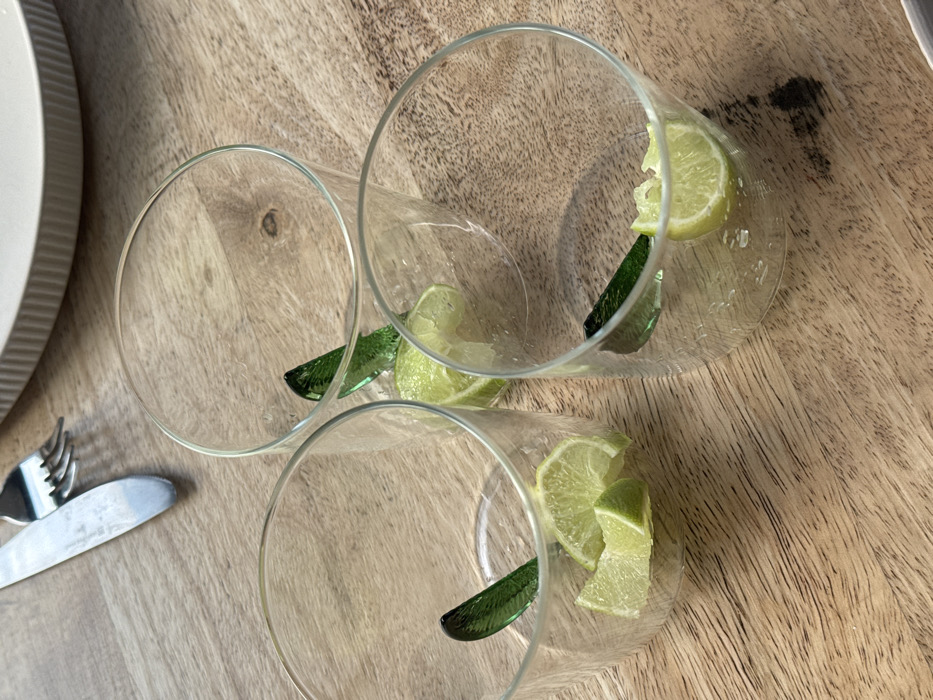 On a light-toned wooden surface in Culburra Beach, Australia, three clear glass tumblers are arranged. Each tumbler contains between one and three freshly cut green lime wedges and a single dark green, leaf-shaped stirring stick. Small droplets or residues are visible within the glasses. In the upper left quadrant, a silver dinner knife and fork are present, with the knife to the left of the fork. A portion of a round, off-white ceramic plate with a ribbed edge is visible in the upper right quadrant. The wooden surface exhibits a discernible grain pattern and minor dark discolored areas. No individuals are present.