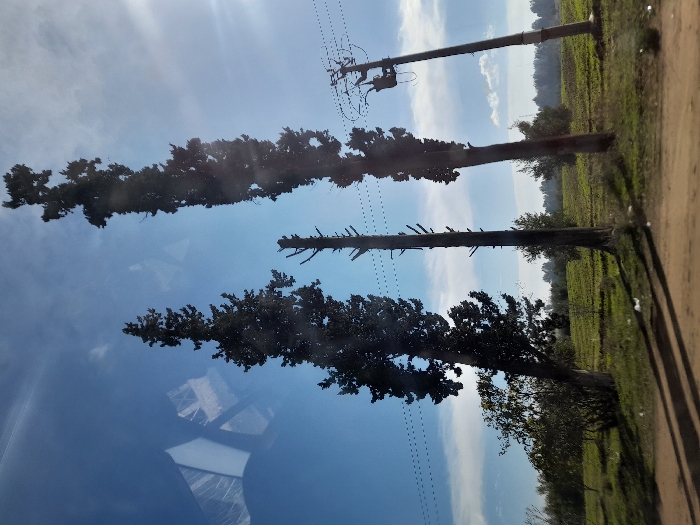 The image displays an outdoor scene in Oued Jdida, Morocco, under a clear blue sky with some scattered white clouds. The perspective suggests it was captured through a window, evidenced by distinct reflections in the upper left quadrant. Direct sunlight from the upper right casts long, dark shadows from the trees across the foreground and introduces a strong lens flare effect in the top right. The immediate foreground consists of reddish-brown soil or an unpaved surface with scattered white debris. This transitions into green grass and low-lying vegetation. Three prominent, tall, slender trees stand vertically in the midground: the leftmost is a dense, dark green conifer; the central tree is a bare, defoliated trunk with short branch stubs; and the rightmost is another tall, dark green conifer, appearing to lean slightly. To the right, a utility pole with multiple horizontal power lines and a dark transformer box is visible. Beyond these features, a large green agricultural field with visible rows extends horizontally towards a distant treeline. No individuals, animals, or specific actions are depicted.