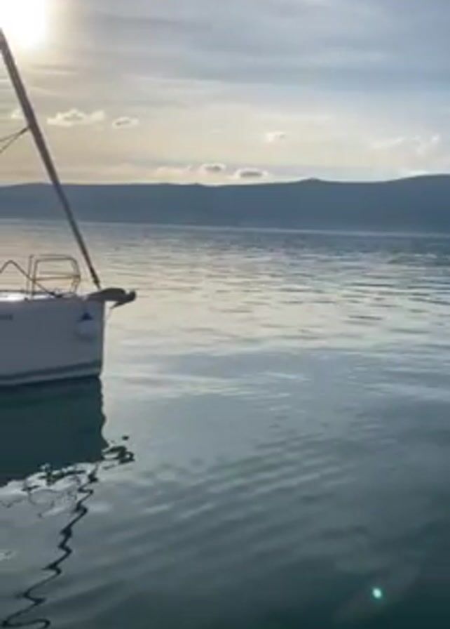 white sailboat floating on calm water with a mountainous shoreline in the background. The sun is bright and partly obscured by clouds. The sailboat is seen from the side, initially showing only the bow, then panning upward to reveal the mast and some rigging. A person appears on the deck of the boat, standing near the back. The water is reflecting the sky, creating a mirrored effect.