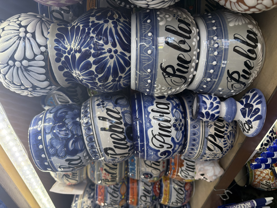 The image displays a dense arrangement of traditional Talavera pottery within a retail environment, identified as a shop or market in Puebla, Mexico
