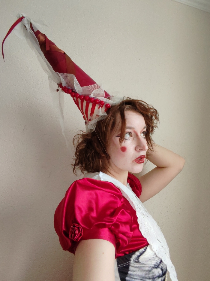 The scene, stated to be located in the city of Riga, Latvia, depicts a person from the upper chest upwards, positioned in profile facing the right side of the frame against a plain, light-colored wall. The individual is a young adult with fair skin and shoulder-length, wavy, reddish-brown hair. They wear theatrical makeup, including a white base, dark winged eyeliner, red circular blush on each cheekbone, and dark red lipstick. The person is adorned with a tall, conical hat, predominantly red, featuring a base with vertical white stripes and a line of red beads. White netting and sheer fabric drape around and extend from the hat. The attire includes a bright fuchsia-red satin top with puffed short sleeves, each decorated with a small, matching fabric rose. A white, possibly lace or embroidered, garment with cut-out patterns is draped over the right shoulder and chest. Beneath these layers, a patterned fabric, appearing to be part of a corset or vest with a black and white design, is partially visible. The individual's left arm is raised, with the hand lightly touching the back of their head or neck, and their gaze is directed upwards and to the right. The background is an unadorned, off-white wall.