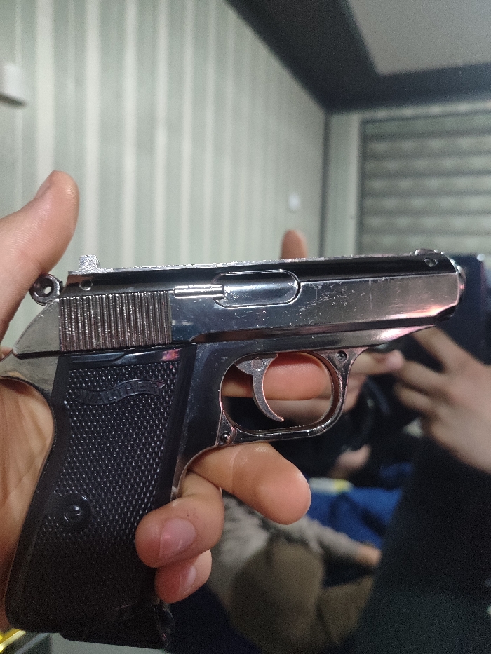 A hand holds a shiny, possibly toy, Walther PPK pistol. The gun is mostly silver colored with a black textured grip bearing the Walther name. A trigger is visible, and the hand is partially obscuring a background with other individuals. The overall scene is somewhat dark and the gun appears to be the primary focus.