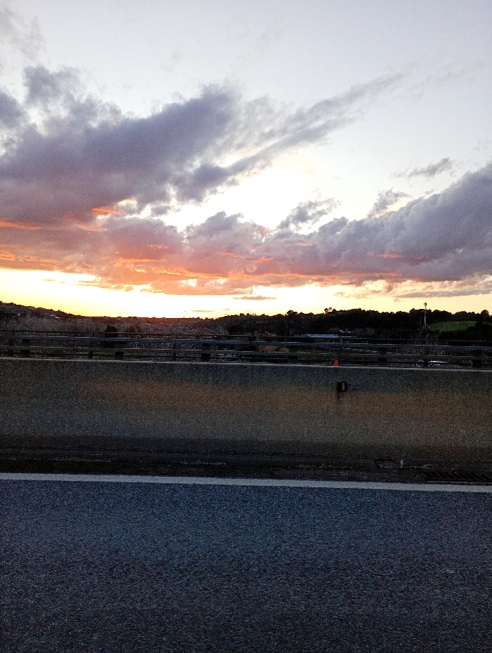 - "A sunset view from a road or bridge, featuring a concrete barrier in the midground" by FM-FHlPg2, licensed under CC BY 4.0