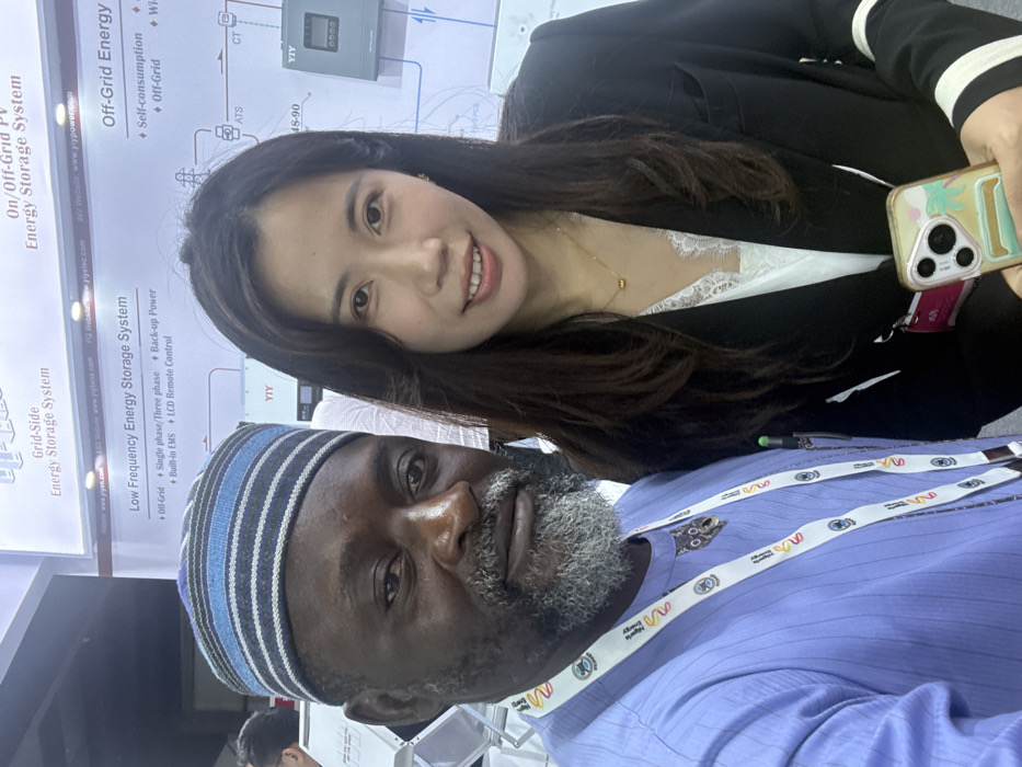 A mid-shot captures a Black male and an East Asian female posing for a photo at an indoor exhibition booth in the city of Itirin, Nigeria. The male, on the left, has dark skin, a grey beard, and wears a light blue traditional tunic with a striped blue and white cap. He has multiple event lanyards draped around his neck, one featuring a metallic pendant depicting a stylized animal face. The female, on the right, has long dark hair and is dressed in a black blazer over a white lace-trimmed top, accessorized with a thin gold necklace. She holds a smartphone with a clear, decorative case in her left hand, positioned near her waist. Both individuals are looking directly towards the camera. The background consists of white exhibition signage detailing "Grid-Side Energy Storage System," "Low Frequency Energy Storage System," and "Off-Grid PV Energy Storage System," with "YIY" branding and illustrative circuit diagrams. The scene suggests a professional trade show or conference setting focused on energy technology.