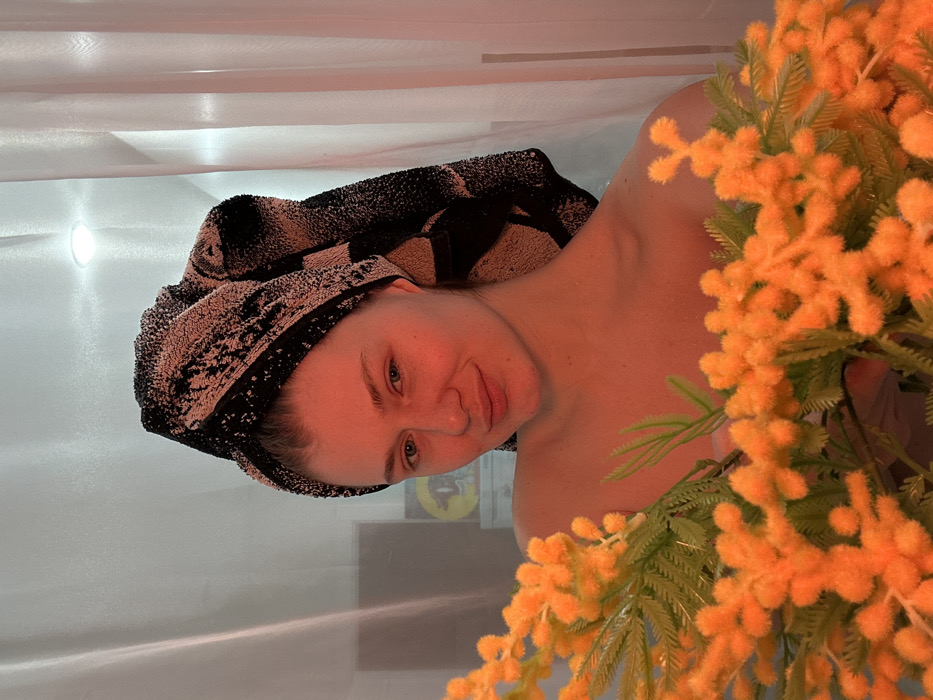 An adult female, appearing Caucasian, is depicted in an indoor setting in Matyushino, Russia, potentially a bathroom or spa area