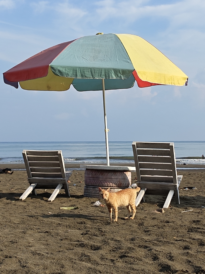 This image depicts a beach scene in Reudeuep, Indonesia. A large, open beach umbrella, composed of red, yellow, and light blue-green panels, stands centrally in the mid-ground. Beneath the umbrella, a small table is fashioned from two stacked dark tires topped with a light-colored surface. Two light-colored wooden beach chairs, designed for reclining, are positioned facing the ocean, flanking the table. In the foreground, an orange tabby cat stands on the dark, damp sand, facing slightly left towards the viewer. The background features a calm, blue ocean extending to the horizon, under a light blue sky with sparse white clouds. Scattered small pieces of debris are visible on the sand near the furniture. Faint, indistinct human figures are discernible in the far distance near the water's edge.