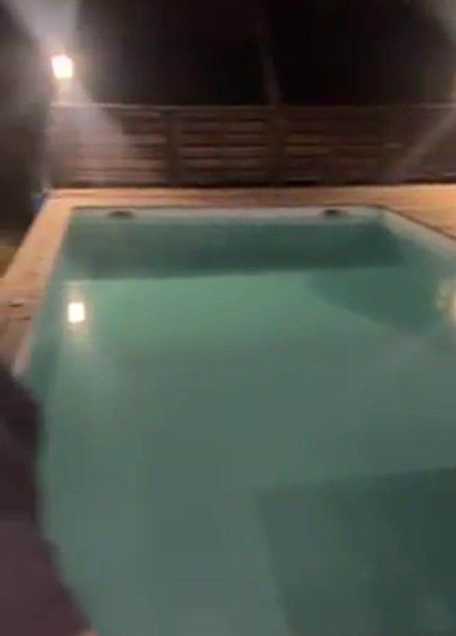 n outdoor space at night with a swimming pool illuminated by a light. The camera pans to a lawn where two men are standing near a grill. One man, wearing a dark t-shirt and blue shorts, uses a long stick to stoke the fire in the grill. The second man is wearing a white t-shirt and white pants. The background is dark, with some foliage visible.