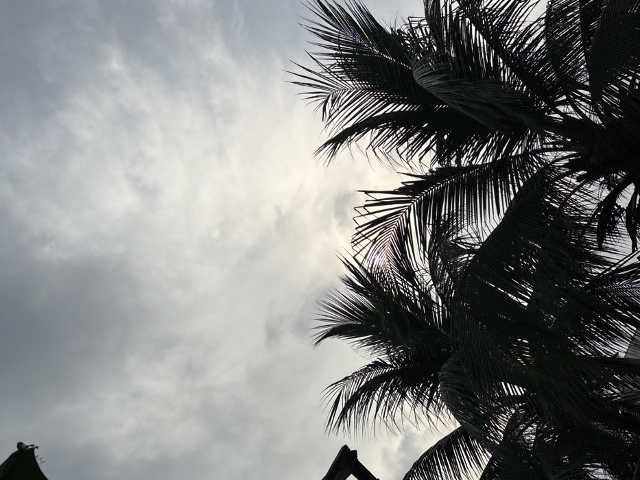 Silhouetted palm trees occupy the right side of the frame against a backdrop of overcast skies. The dense foliage of the palm fronds creates an intricate pattern, contrasting with the muted grey hues of the sky. Sunlight barely peeks through the clouds.