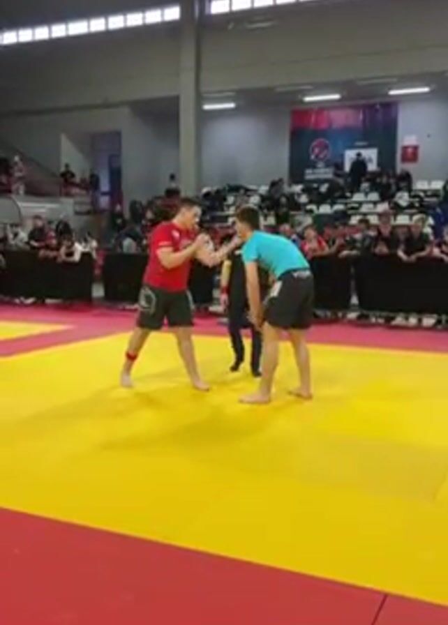 Two men are wrestling in a brightly lit indoor gymnasium. The wrestlers are barefoot and wearing athletic shorts and t-shirts. One is wearing a red shirt, and the other is wearing a light blue shirt. They are wrestling on a yellow mat outlined in red. A referee is standing by, observing. Behind them is a crowd of spectators seated in bleachers. A large sign with images is visible behind the crowd. The video is shot at eye level.