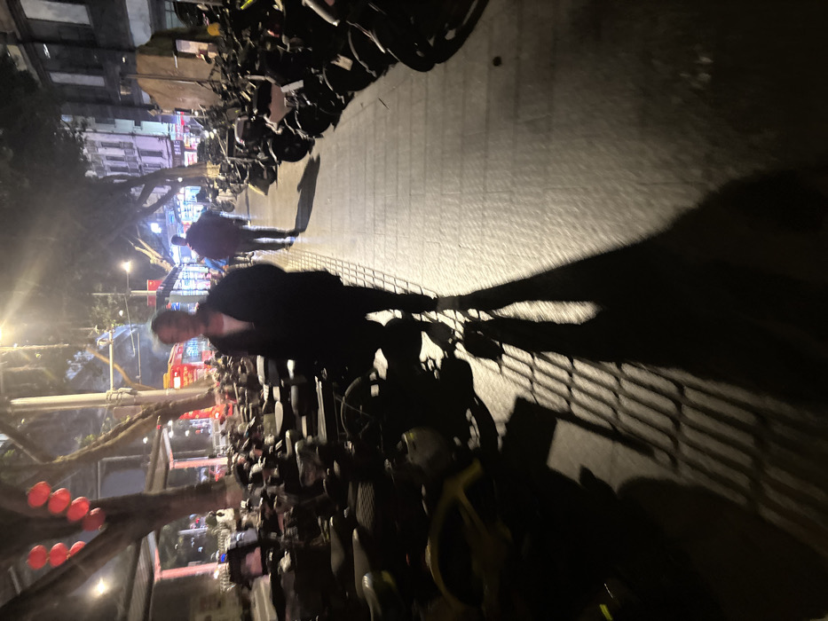 The image displays a nighttime urban street scene in Baiyun District, China. A paved pedestrian walkway traverses the center of the frame, extending from the foreground into the background. Both sides of this walkway are densely lined with parked two-wheeled vehicles, primarily shared bicycles and electric scooters. In the foreground, a single individual, slightly blurred from motion, walks towards the camera. This person wears a dark jacket over a lighter-colored inner garment. A long, distinct shadow stretches from their feet onto the walkway, extending towards the right side of the frame. Further down the walkway, in the mid-ground, a second individual is seen from behind, walking away from the camera. This person also wears dark clothing and casts a visible shadow. To the left of the walkway, several trees are present, from which multiple red, spherical decorative lanterns hang. A red public transport bus is partially visible in the mid-ground on the left. The background on the right features multi-story buildings with illuminated windows, indicating commercial or residential structures. The entire scene is illuminated by artificial streetlights, which generate strong contrasts and prominent shadows on the ground. No direct interactions between the visible individuals are apparent.