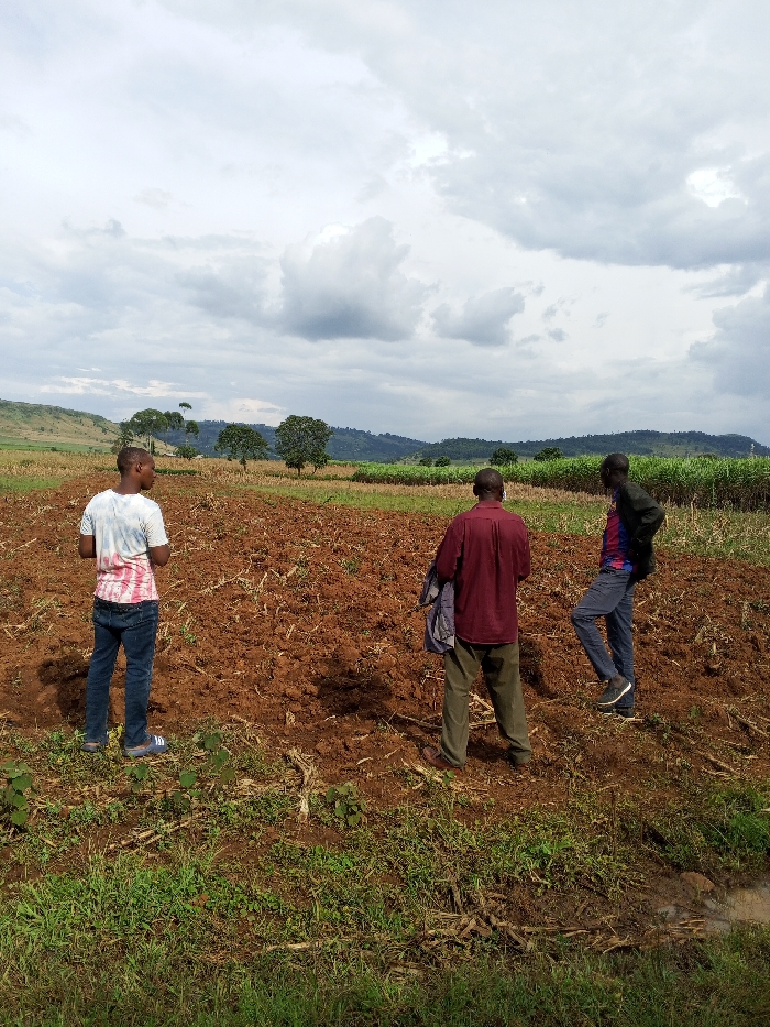 Three males are present in an agricultural field within Keyian ward, Kenya, under an overcast sky with distant hills