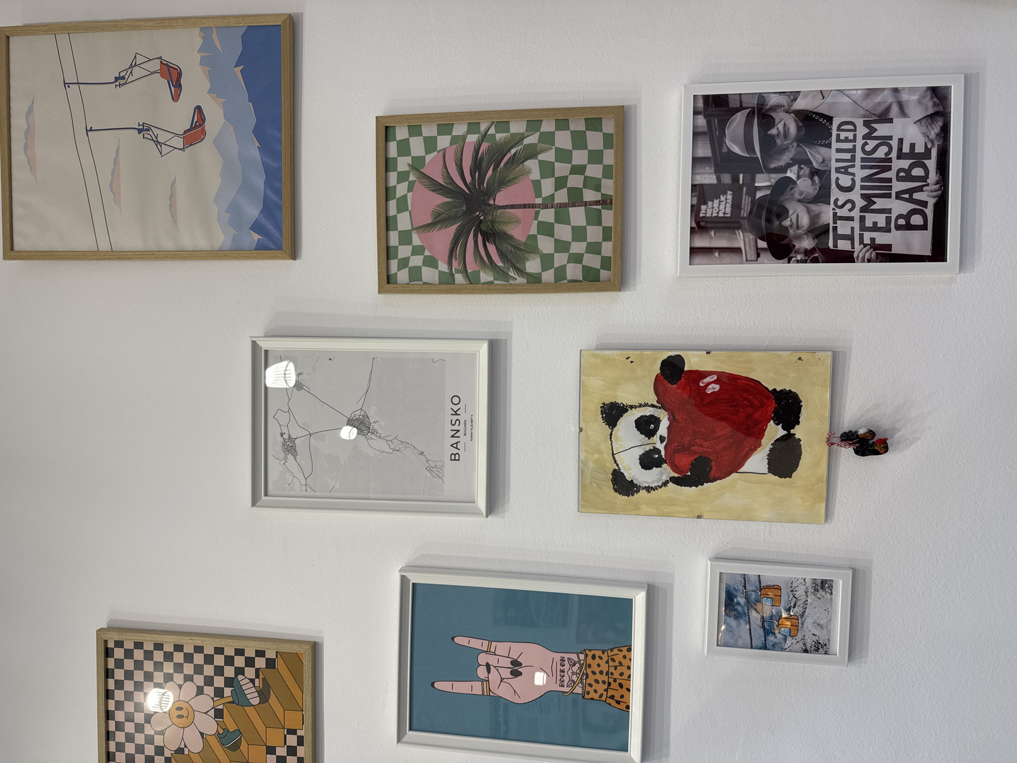 - "The image displays a white wall adorned with nine distinct artworks, confirming an indoor location within Bansko, Bulgaria, as evidenced by a framed map explicitly labeled "BANSKO, BULGARIA" with coordinates 41" by FM-etByS2, licensed under CC BY 4.0