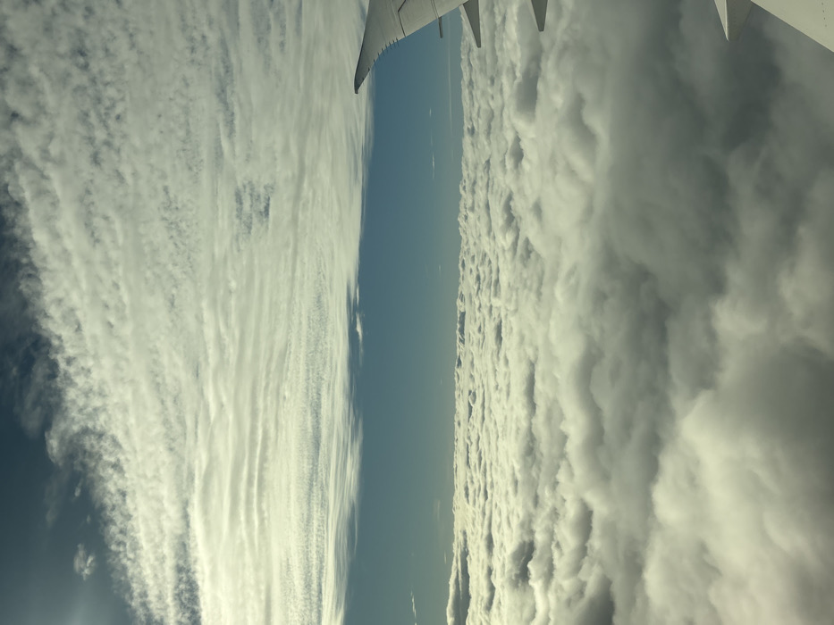 An aerial view from an airplane window shows a clear blue sky sandwiched between two layers of clouds