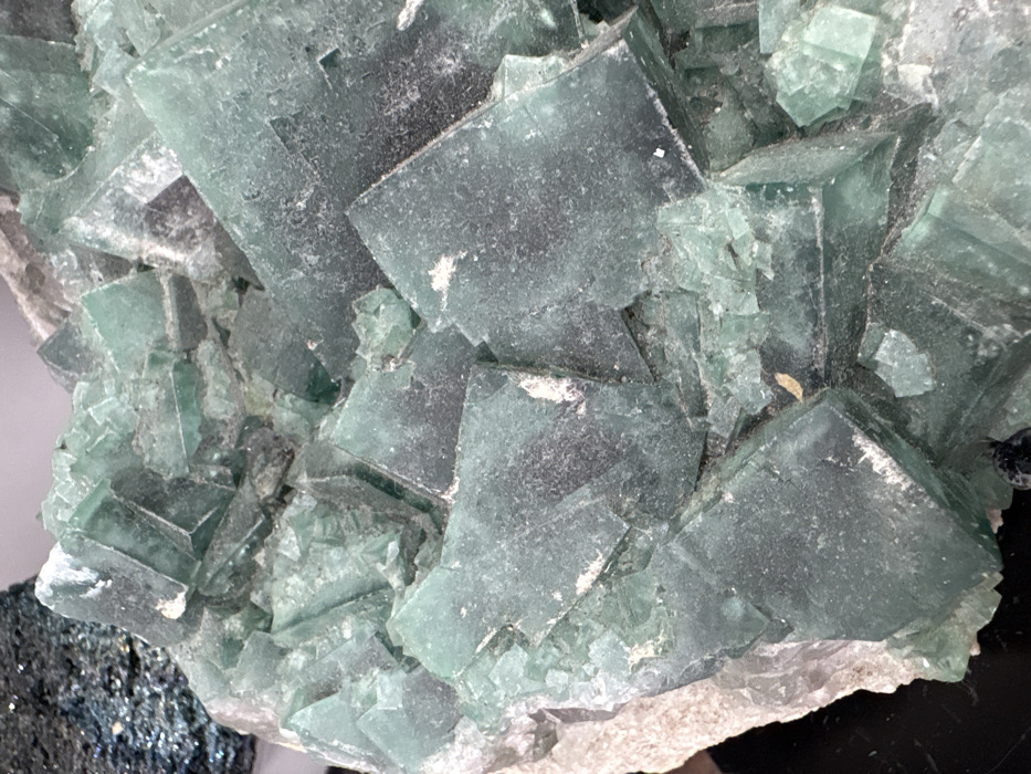 A collection of green fluorite crystals forms a cluster. The crystals exhibit a cube-like structure with visible internal patterns and imperfections. The overall color is a muted green with hints of gray. Small, white particles are scattered across the surface. The crystals sit on a base of white, earthy material, possibly another mineral or rock matrix. A dark, metallic-looking mineral is visible on the bottom left of the image.