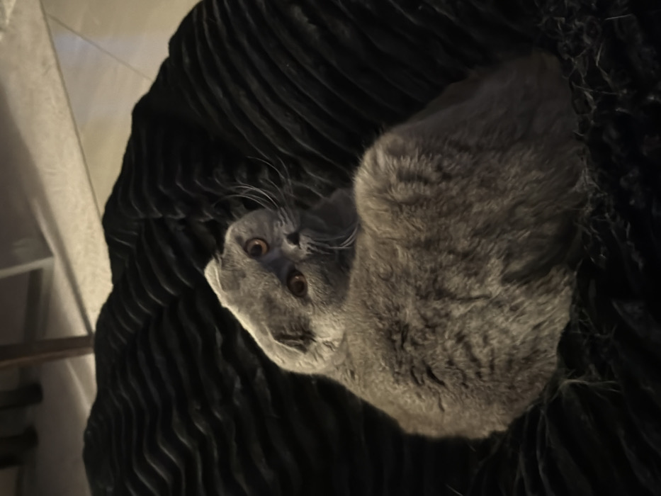 - "A grey Scottish Fold cat is observed resting on a black, deeply textured blanket or cushion" by FM-cv26J2, licensed under CC BY 4.0