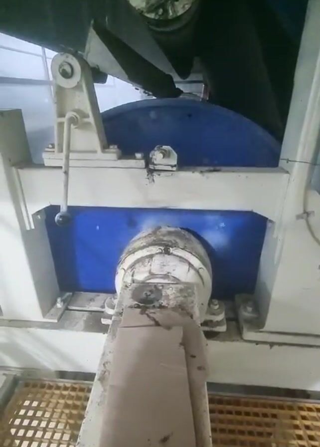 static shot of a piece of industrial machinery. The machine is primarily white and blue, with a large blue disc visible between the structural supports. A dirty, cylindrical component is positioned at the bottom center of the frame, partly obscured by a brown piece of material. The machine sits on a yellow, gridded surface. The environment appears to be dimly lit.