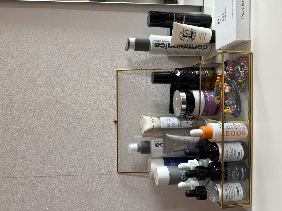 The image displays a collection of skincare products and personal items arranged on a white surface against a light, textured wall
