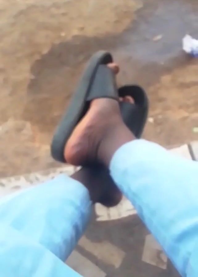 person sitting with their legs extended forward. They are wearing light blue pants and black sandals. The background is blurred, but appears to be a concrete or dirt surface. There is some indistinct trash visible in the background.