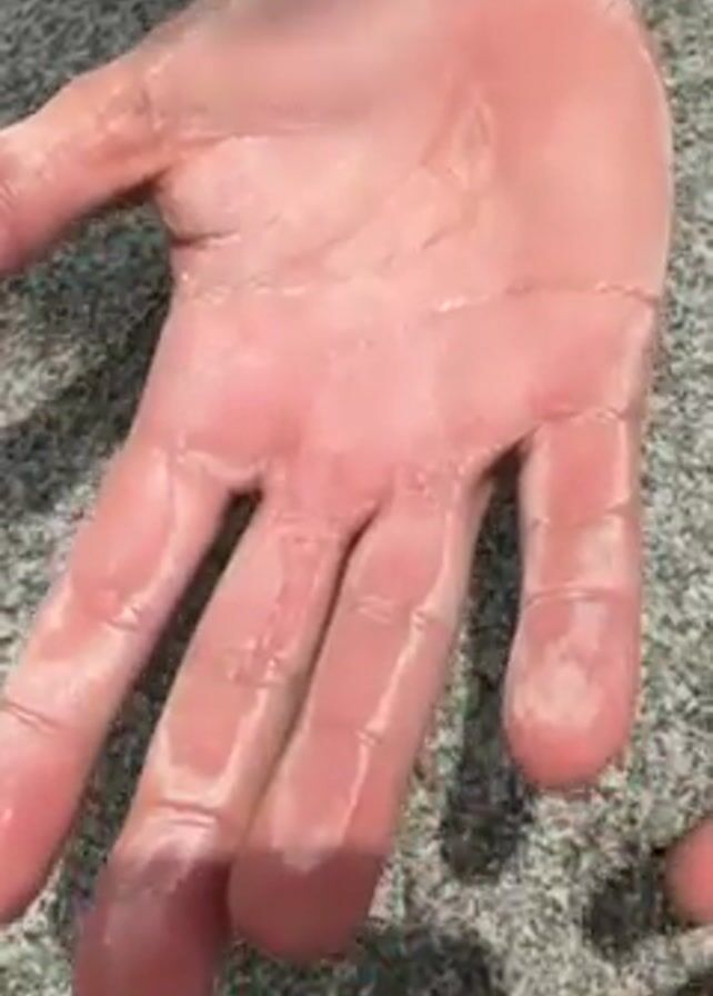 n open human hand with a layer of white powder being sprinkled onto it. The powder appears to be magnesium carbonate, also known as chalk, which is commonly used to improve grip. The palm and fingers are pinkish, with prominent lines and textures. The hand is positioned against a gray, textured surface. The person is wearing a black cuff or band on their wrist.