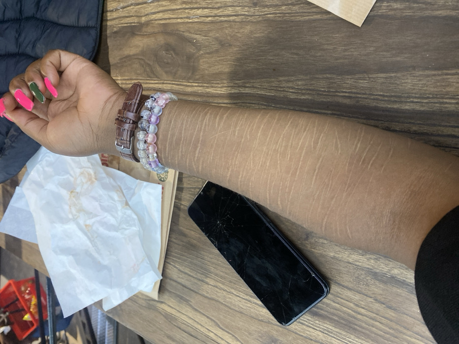 A close-up, high-angle image depicts a dark-skinned individual's left forearm and hand resting on a wooden table. The forearm exhibits numerous healed, linear scars. The wrist is adorned with a brown leather watch featuring a silver buckle, and two translucent, multi-colored beaded bracelets. The visible fingernails on the left hand are painted, with the thumb and index finger in bright pink and the middle finger in dark green. A black smartphone with a severely cracked screen lies face-up on the table to the left of the arm. In the background, crumpled white paper with light stains and a brown paper bag displaying a partial "Burger King" logo are visible, indicating the scene is within a Burger King restaurant in Nairobi, Kenya. A red shopping basket and a metal rack are partially visible in the upper left background. No specific action is observed beyond the static placement of the arm and objects.