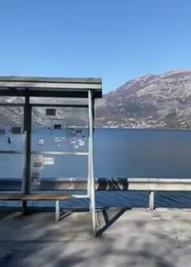 view of a lake and mountains from a bus stop. The bus stop has a clear roof and walls, and a bench inside. The lake is blue and still, with mountains in the background. The sky is clear and blue. A guardrail is in the foreground, along the edge of the road. A red buoy can be seen in the lake.