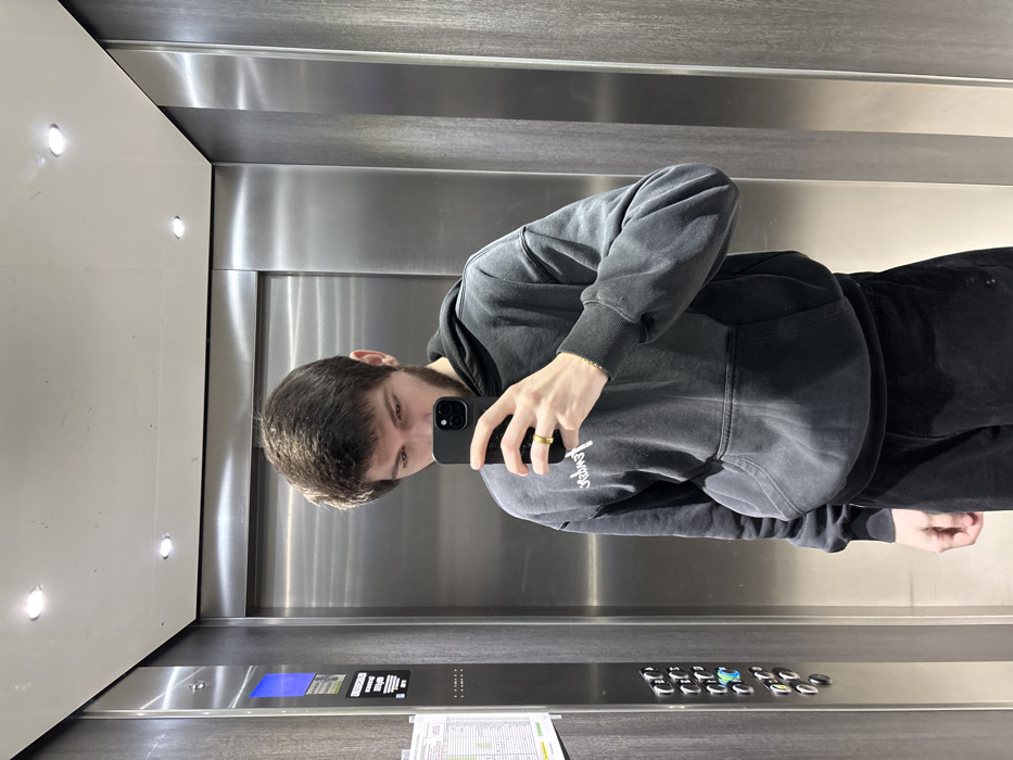 A man takes a selfie in an elevator. He's wearing a dark gray hoodie with white lettering and dark pants. He has short brown hair. The elevator has stainless steel walls and a white ceiling with recessed lights. The elevator panel is visible, displaying floor numbers and buttons.