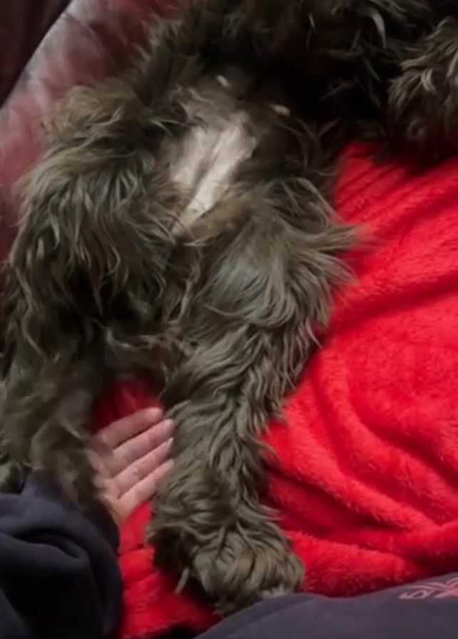 A person sits in dark-colored clothing on a brown leather couch, touching the underbelly of a medium-sized, shaggy, brown dog lying on a red fleece blanket. The dog appears to be on its back, with its legs and belly exposed. The lighting is dim, and the view is a close-up shot.