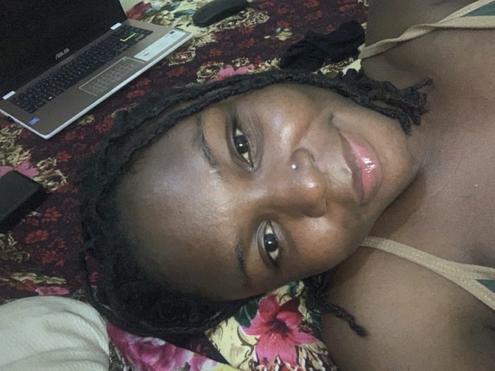 - "A woman with dreadlocks, tan skin, and a nose piercing lies on a floral patterned bedcover" by FM-rhFJW2, licensed under CC BY 4.0
