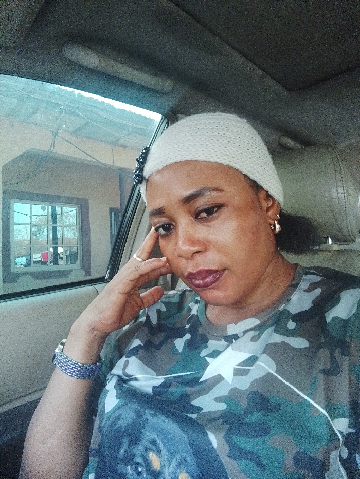 A woman poses indoors, likely in a car, looking at the camera. She wears a knitted white hat with beaded embellishments, a ring, hoop earrings, and a blue bracelet. Her attire is a camouflage-patterned t-shirt featuring a dog image and a white star design. The background shows a building through the car window, adding context to her location.